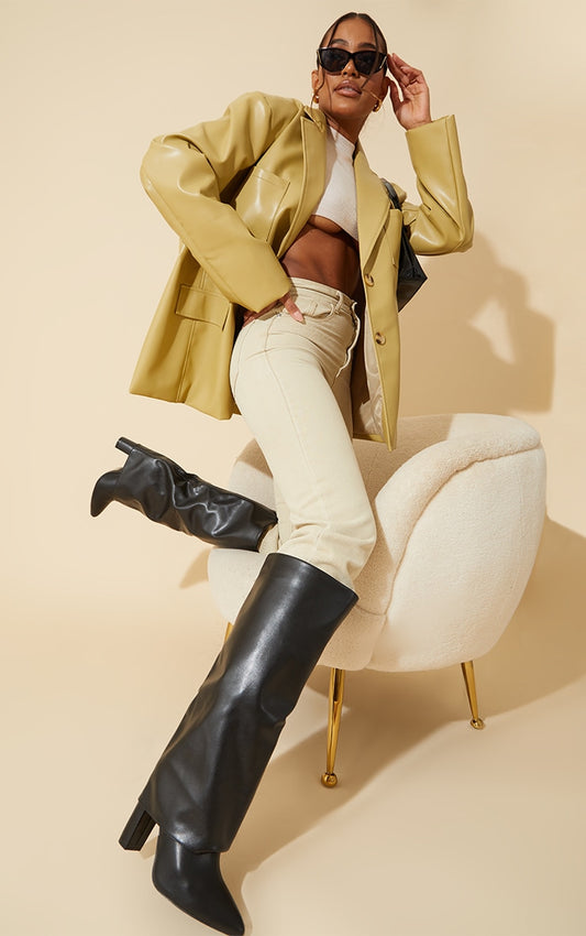 Black Wide Fit Pu Pointed Fold Over Block Heel Knee Boots