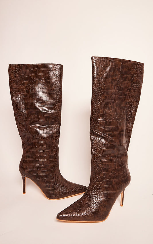 Chocolate PU Croc Detail Point Toe Stiletto Heeled Knee Boots