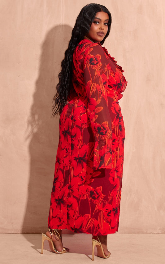 Plus Red Floral Print Chiffon Frill Midi Dress