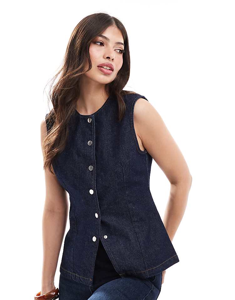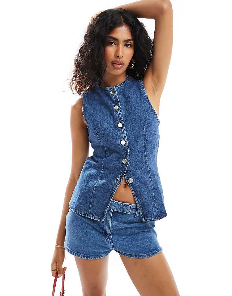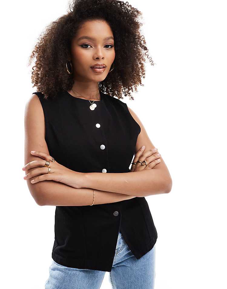 DESIGN denim split front waistcoat in burgundy