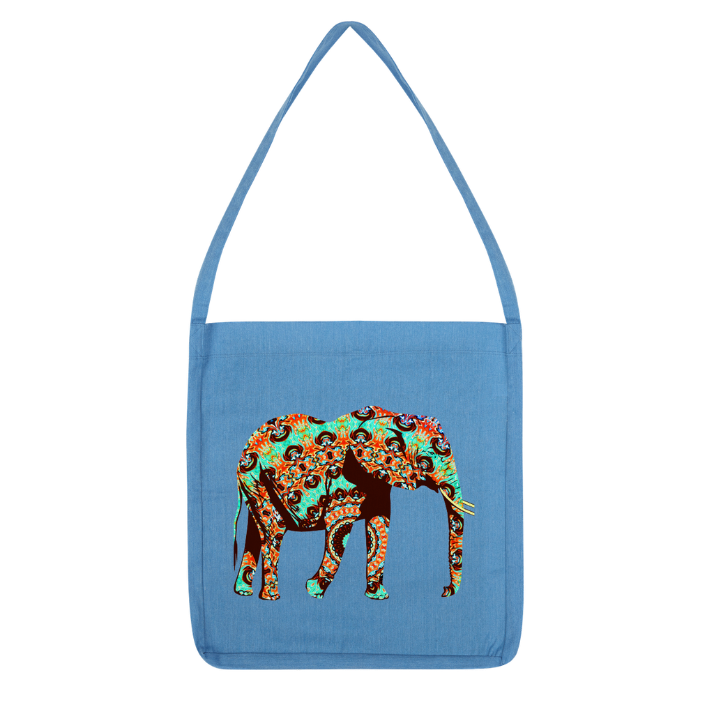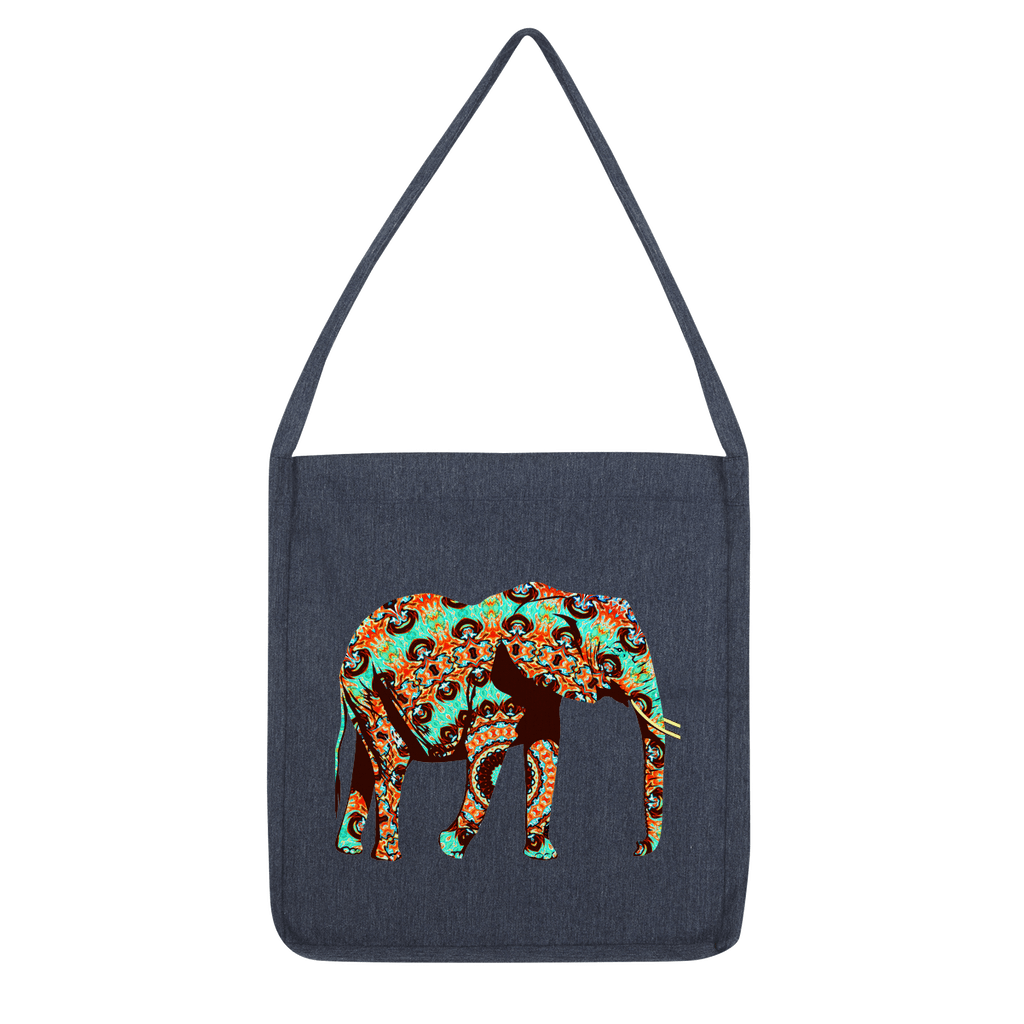 This long-strap printed tote bag is made from 100% recycled materials. Stylish, and environmentally friendly too! Also features a hidden metal snap fastening for added security. Size is 13" x 14.5", strap length approx. 31".