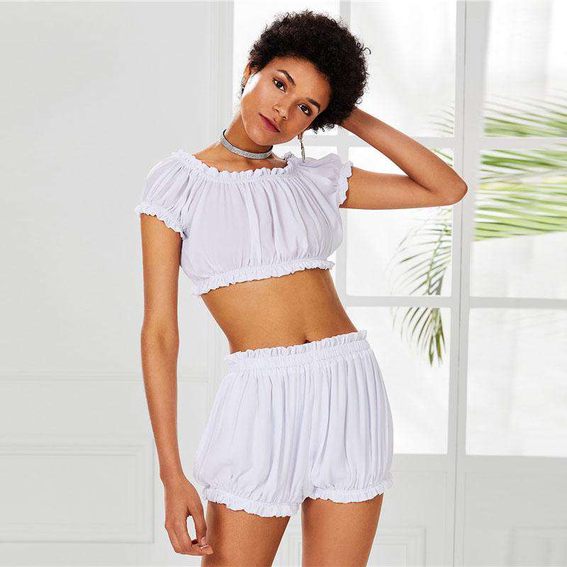 SHEIN White Frilled Crop Crinkle Top & Shorts Set