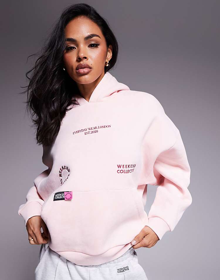 Weekend Collective hoodie with bright pink label detail in washed pink
